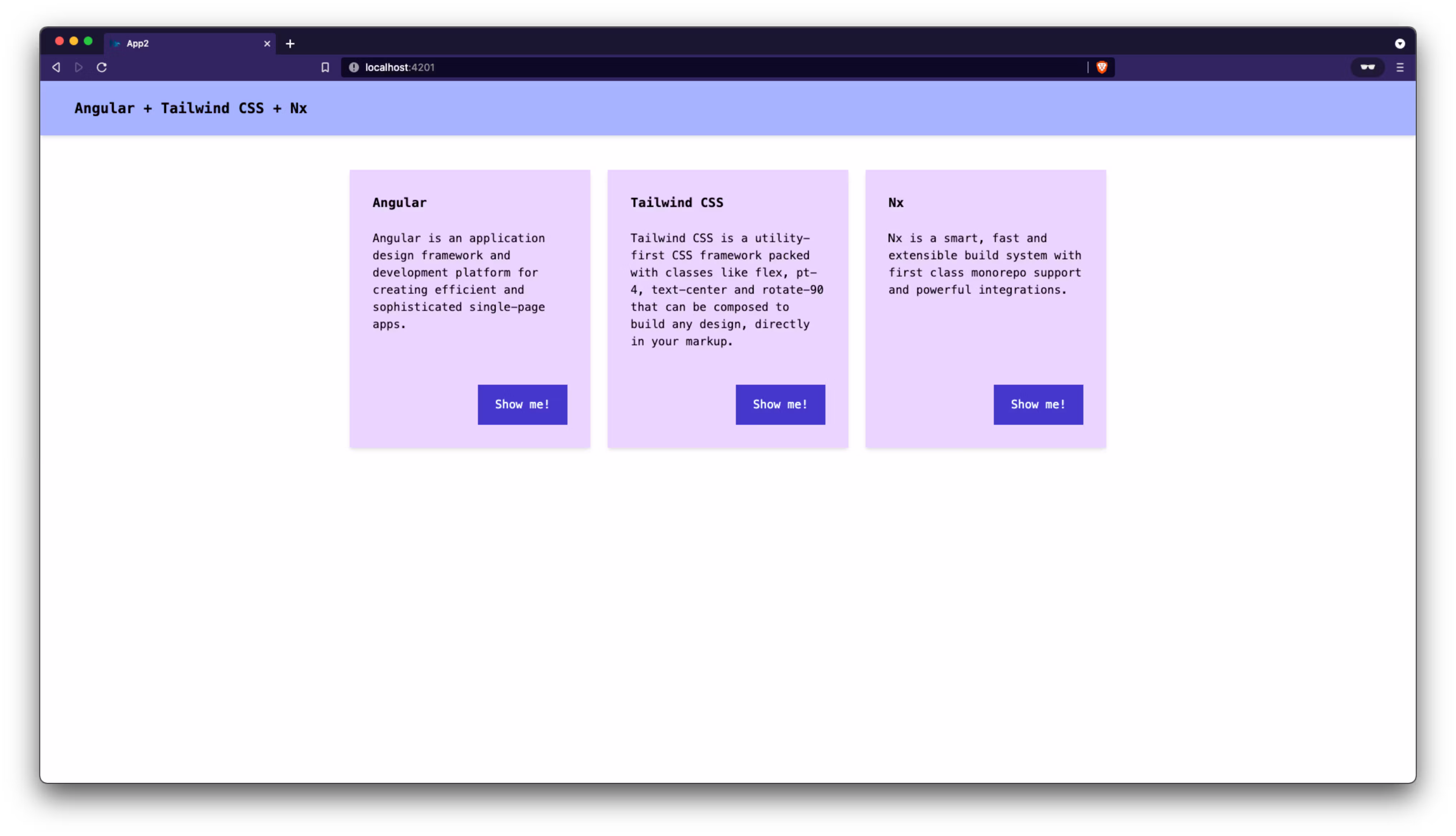 2  <header class="px-xl py-md bg-primary-light text-xl font-bold shadow-md">Angular + Tailwind CSS + Nx</header>